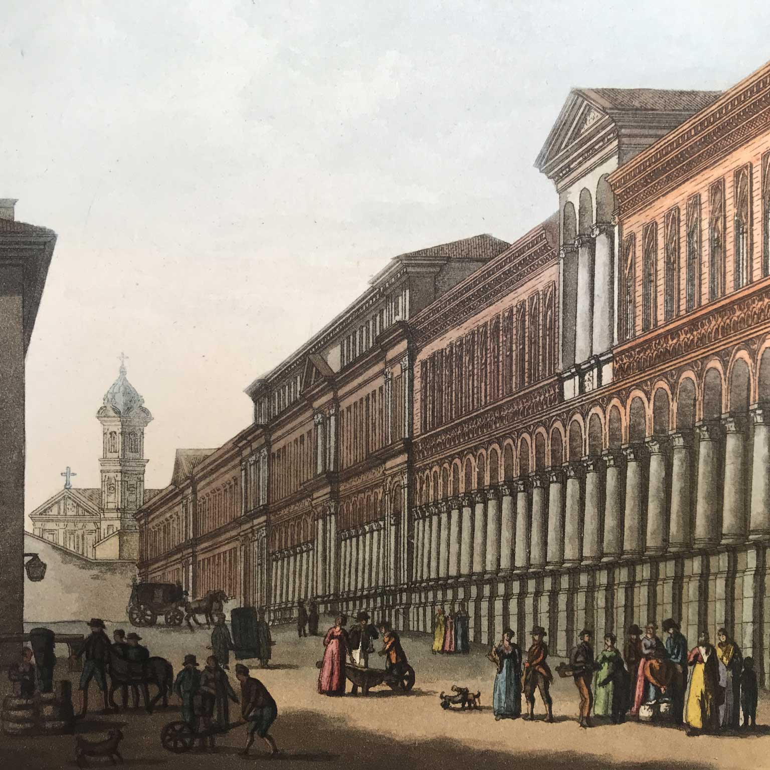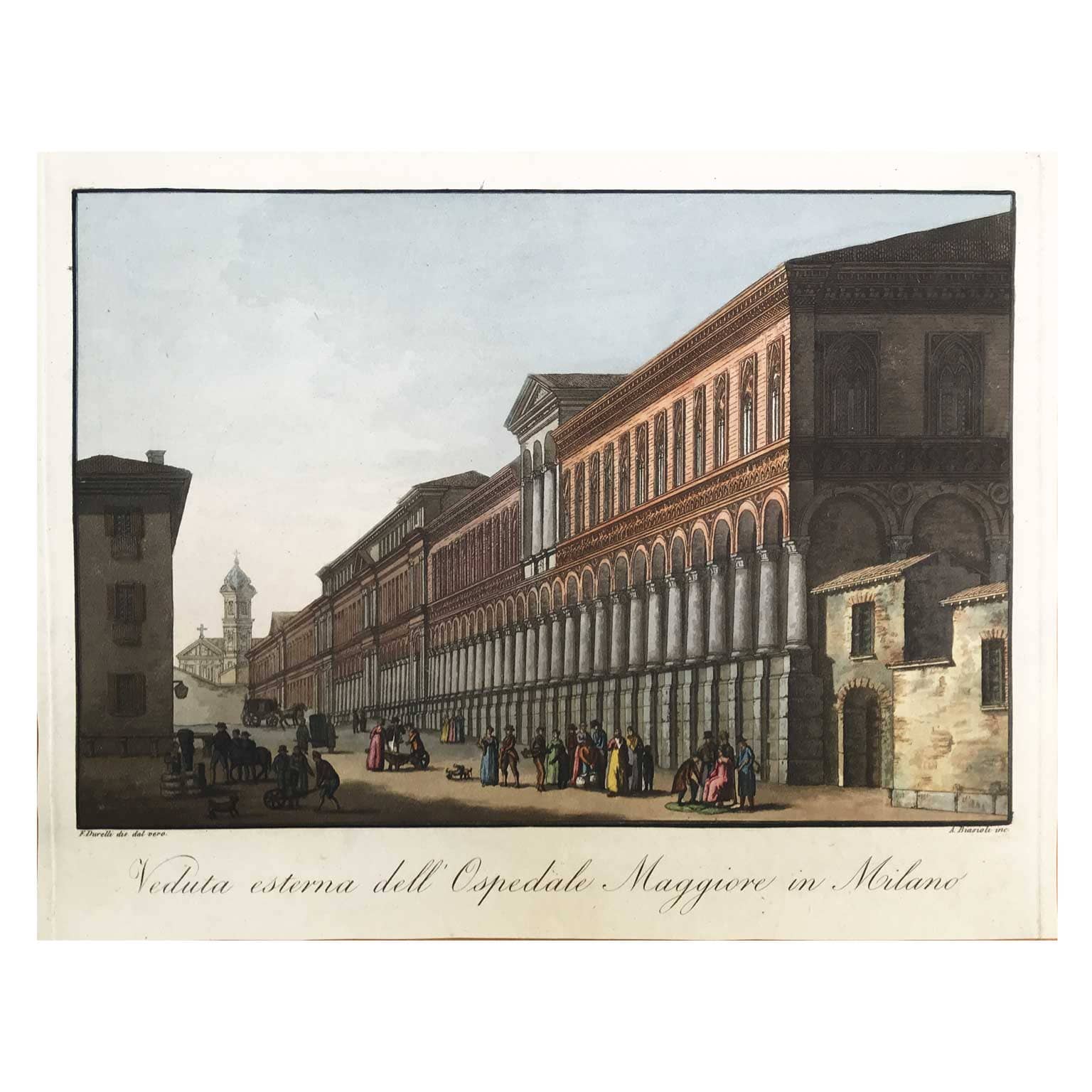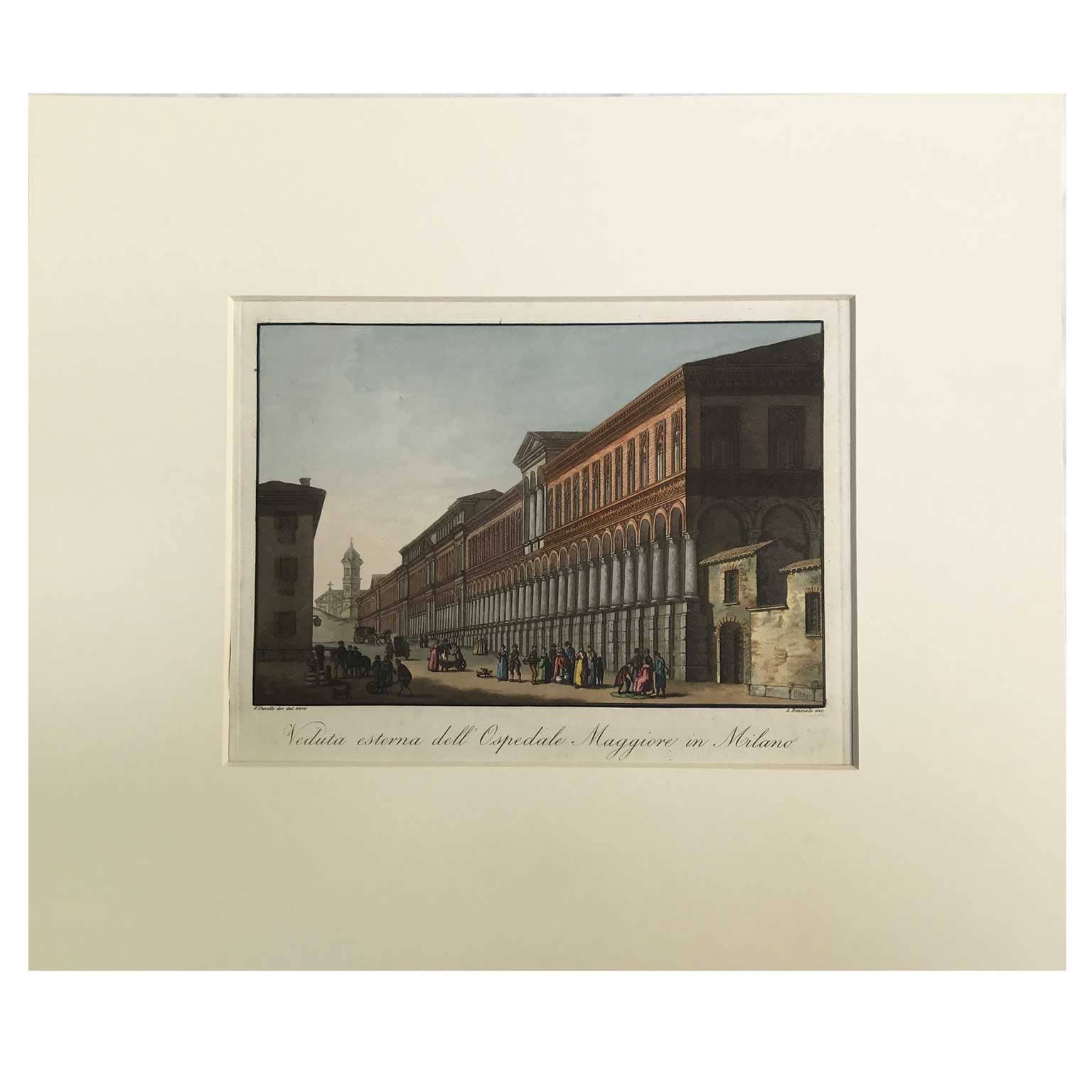 Veduta dell’Ospedale Maggiore in Milano del 1820-21 Acquatinta con bella veduta animata dell’Ospedale Maggiore in bella coloritura coeva. Applicata in quattro punti su supporto cartaceo coevo.  Questa stampa antica dell’ Ospedale Maggiore Cà Granda,  storica sede dell’ Università Statale di Milano, si presenta  in buono stato di conservazione, entro passe-partout in cartoncino.