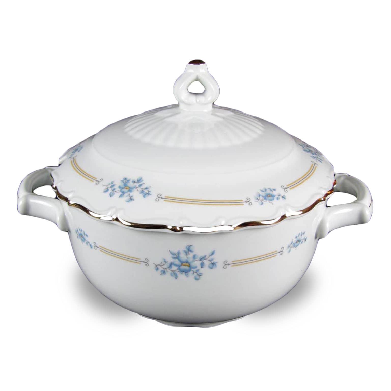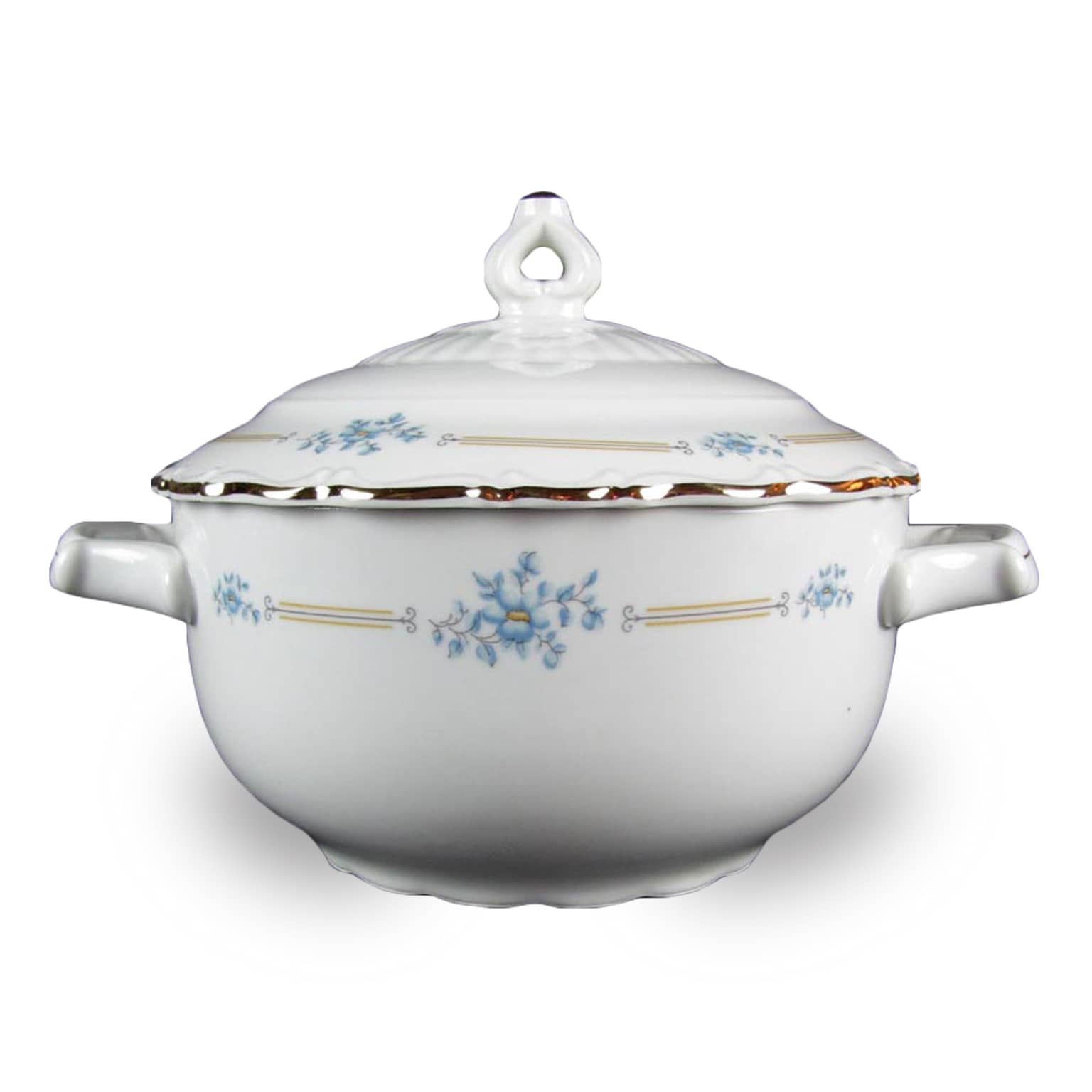 Zuppiera con coperchio, biansata, di forma circolare, in porcellana bianca finemente decorata con motivi geometrici, floreali  policromi e profili dorati. Si presenta in perfetto stato di conservazione e risale alla metà del XX secolo.