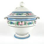 Antica zuppiera tonda con coperchio e manici in porcellana dipinta con decoro floreale sui toni del celeste. Manifattura francese della fine Ottocento. Si presenta in buono stato di conservazione con pomolo incollato. Difetti e restauri.
