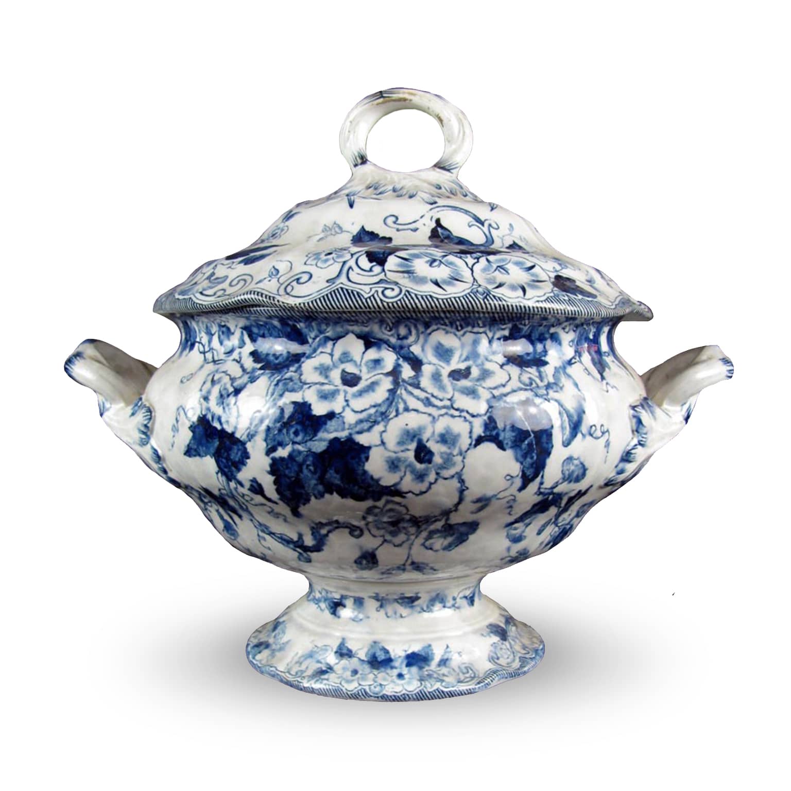 Zuppiera tonda con decoro blu con manici a fondo bianco con decori floreali blu. Parigi, Francia, in perfetto stato di conservazione. Marchio non leggibile.
