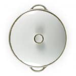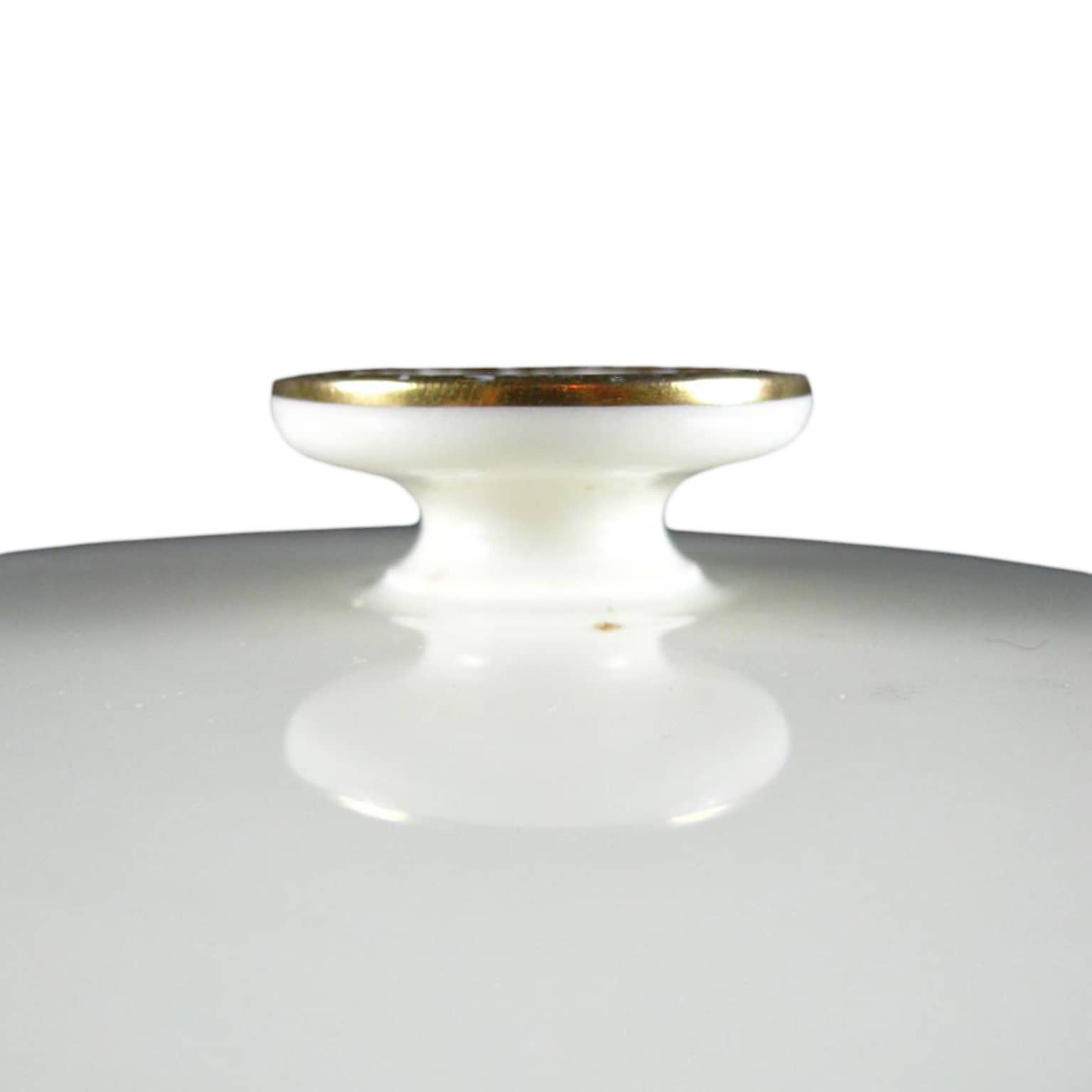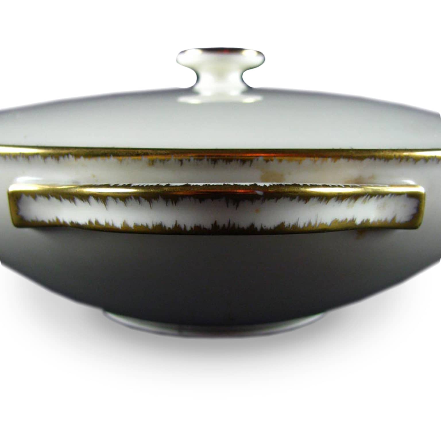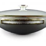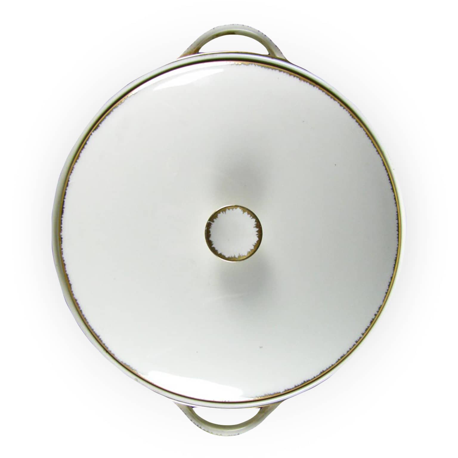 Zuppiera tonda in porcellana avorio e oro con manici con un profilo frastagliato in oro in perfetto stato di conservazione. Sotto il marchio “H & G Bavaria Germany – Heinrich – San Paolo Otto”.